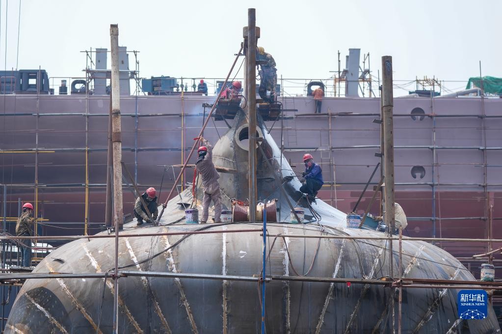 图为中国山东省威海市的黄海造船有限公司厂区正在建造船舶(2022年5月20日摄)。新华社资料图