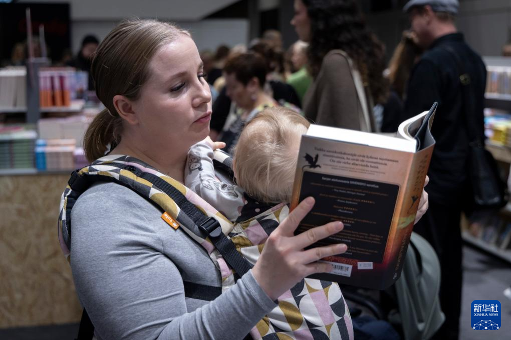 10月25日,在芬兰首都赫尔辛基会展中心举行的第25届赫尔辛基书展上,一名带着孩子的女子阅读书籍。