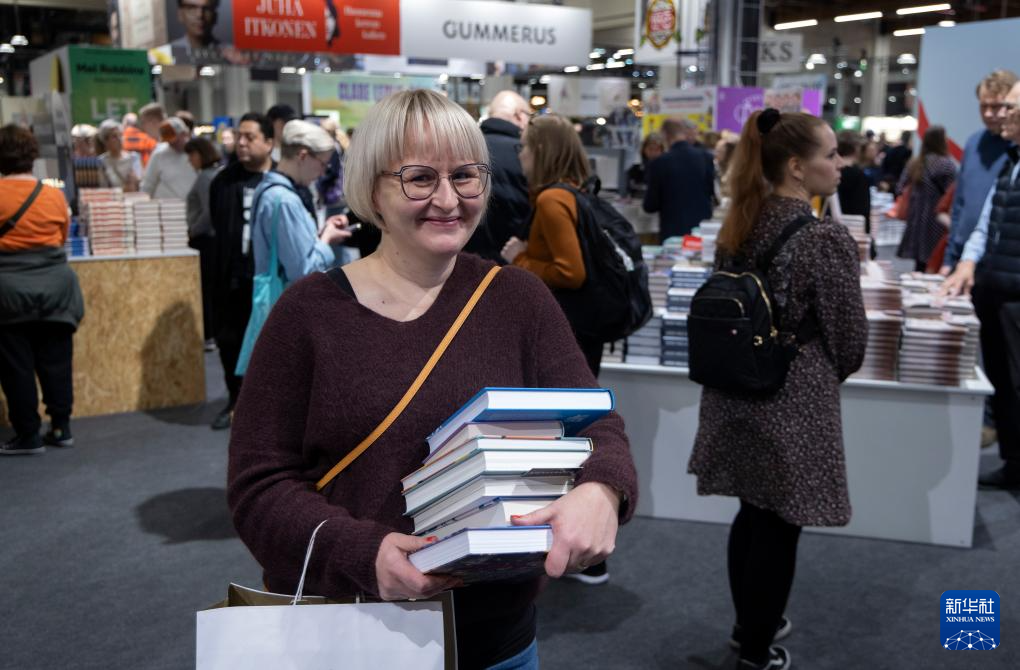 10月25日,在芬兰首都赫尔辛基会展中心举行的第25届赫尔辛基书展上,一名女子怀抱选购的书籍。