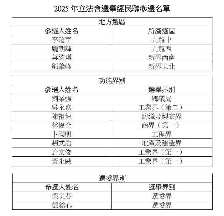 经民联指,今次参选的14位成员,平均年龄49岁。其中出选地方选区的共有4位,包括九龙中、九龙西、新界西南和新界东北;出选功能界别的有8位,包括乡议局、工业界(第一) 、工业界(第二)、纺织及制衣界、商界(第一)、工程界和地产及建造界;出选选委界别的有2位。