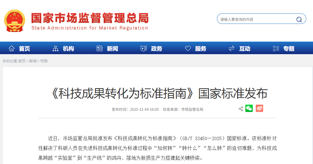近日,中国市场监管总局发布《科技成果转化为标准指南》,破解科研人员将先进科技成果转化为标准过程中面临的“如何转”、“转什么”、“怎么转”等现实难题,为科技成果从“实验室”迈向“生产线”搭建关键桥梁,加速形成新质生产力。