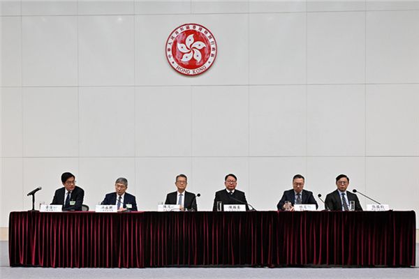 (左起)财政司副司长黄伟纶、政务司副司长卓永兴、财政司司长陈茂波、政务司司长陈国基、律政司司长林定国资深大律师,以及律政司副司长张国钧博士出席交流会。
