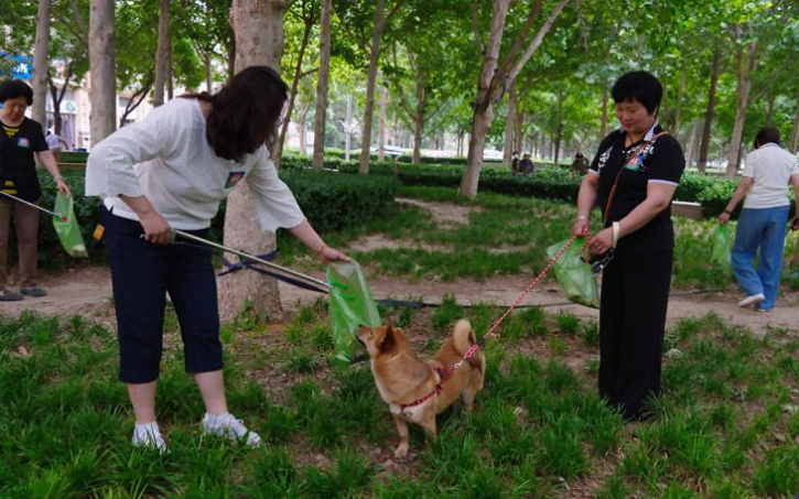社区居民清理花园里的宠物粪便。新京报记者 郭延冰 摄