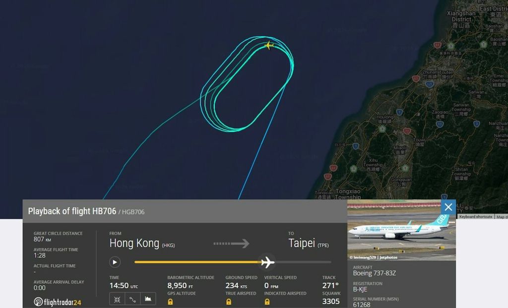 大湾区航空一班原订昨晚(15日)由香港飞往台北的航班,由于桃园国际机场附近大雾,客机只能在新竹外海盘旋等待天气好转。惟当盘旋约7个圈后,航机油量已不足支撑等候时间,只能折返香港入油。