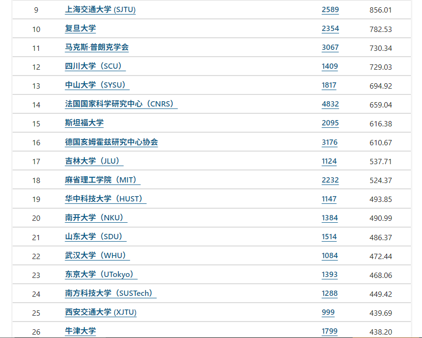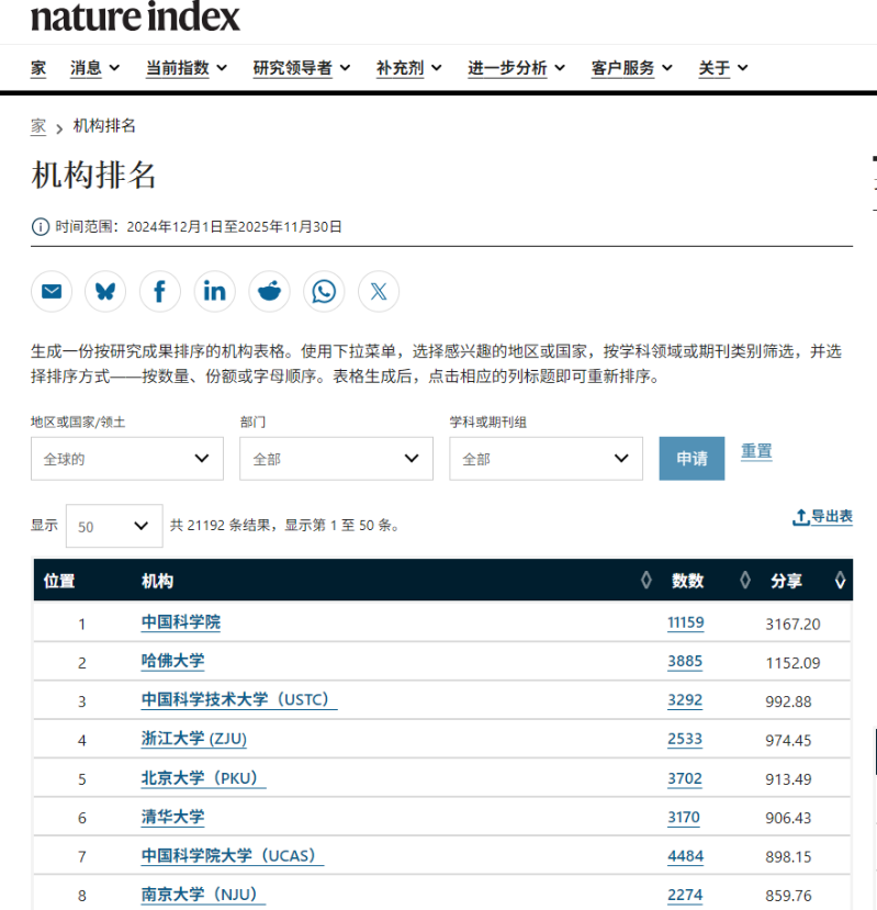 “自然指数”由国际知名科技出版机构施普林格·自然集团下属机构编制并定期发布,是衡量高水平科研产出的重要指标。此次排名基于2024年12月1日至2025年11月30日期间发表在各个科学领域145种学术期刊上的论文数据综合评定。
