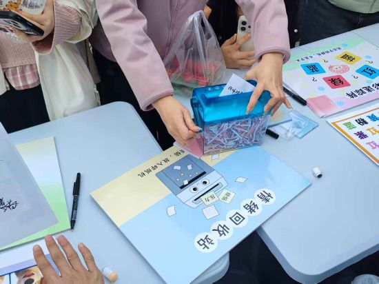 “情绪回收站·烦恼粉碎”摊位设有“烦恼投递箱”和“粉碎器”,同学们把自己的烦恼、焦虑写在纸上,投入投递箱,再亲手将“烦恼”粉碎。“把烦恼‘碎’掉的感觉太爽了,整个人都轻松了!”一位同学一边粉碎“烦恼”,一边笑着说道。