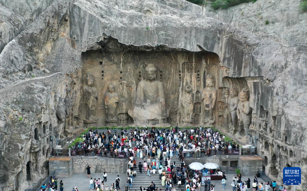 2025年4月24日,游客在河南省洛阳市龙门石窟景区游览(无人机照片)。