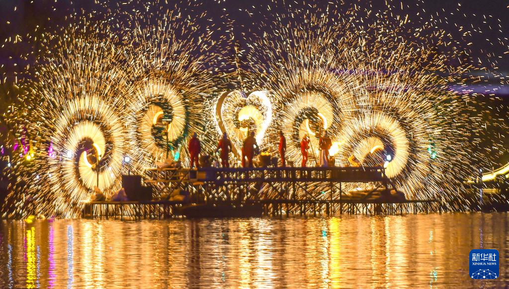 这是2026年2月17日在河南省洛阳市隋唐城遗址植物园“神都上元灯会”上拍摄的水上打铁花表演。