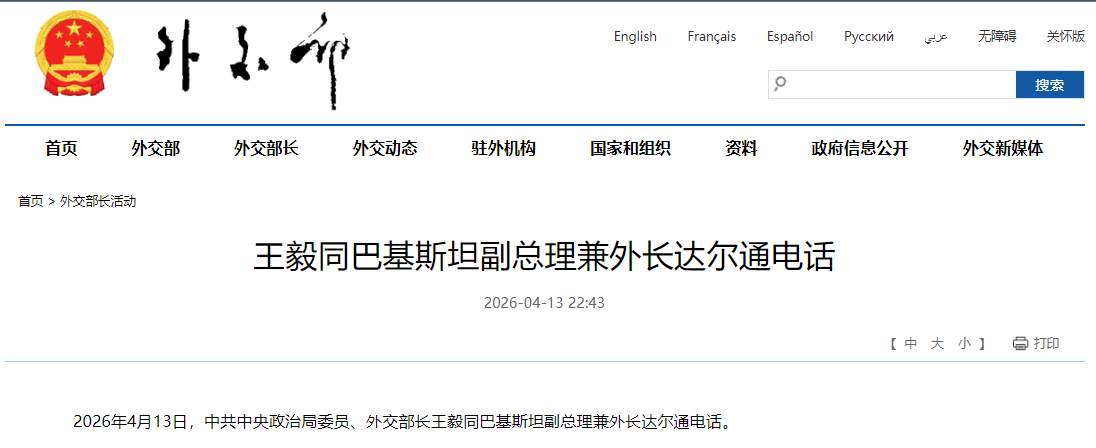4月13日,中国外交部长王毅同巴基斯坦副总理兼外长达尔通电话时表示,当前美伊停火局面十分脆弱,地区局势处于关键转折阶段。