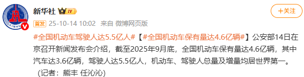 公安部14日在京召开新闻发布会介绍,截至2025年9月底,全国机动车保有量达4.6亿辆,其中汽车达3.6亿辆,驾驶人达5.5亿人,机动车、驾驶人总量及增量均居世界第一。