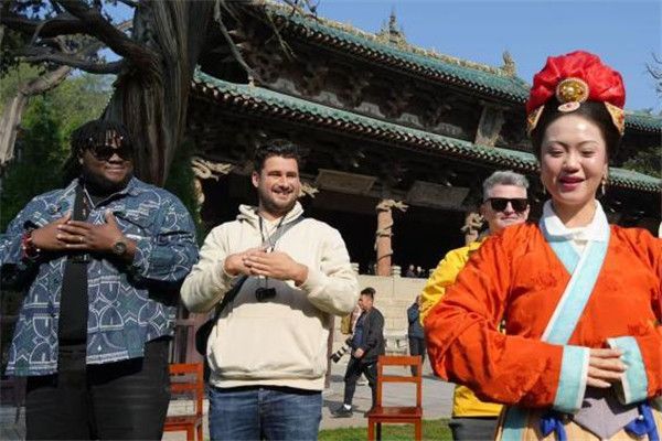 “男子左手覆于右手之上,女子右手轻搭左手,腰背微躬,敬意自显......”晋祠圣母殿前,外籍博主和专家在礼仪老师指导下学习传统拱手礼。这份跨越千年的礼仪,成为他们理解山西古建筑文化的第一把钥匙。