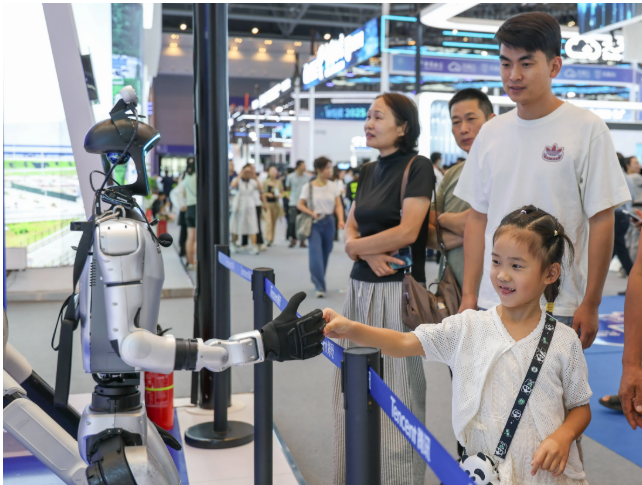 ▲9月8日,在2025世界智能产业博览会现场,一人形机器人与小朋友握手。图/新华社