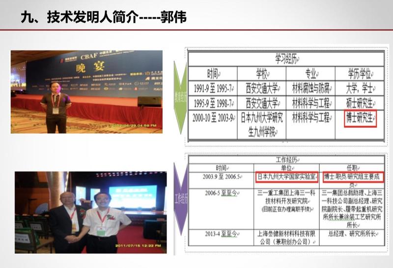 即使是商业公司,郭伟仍然设法使其与科研“沾边”。新京报记者获取到郭伟向投资者、企业展示的材料文件中,他将2013年兼职创办的上海叁健新材料科技有限公司描述为研究所性质单位,自称担任总经理兼研究所所长,同时还标榜自己是“涂装工艺研究所所长”。