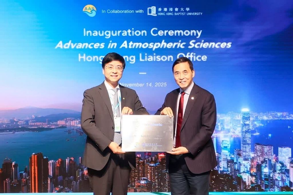 《大气科学进展》主编曹军骥(左)及浸大副校长(研究及拓展)暨研究院院长吕爱平(右)为《大气科学进展》香港联络办公室揭牌。