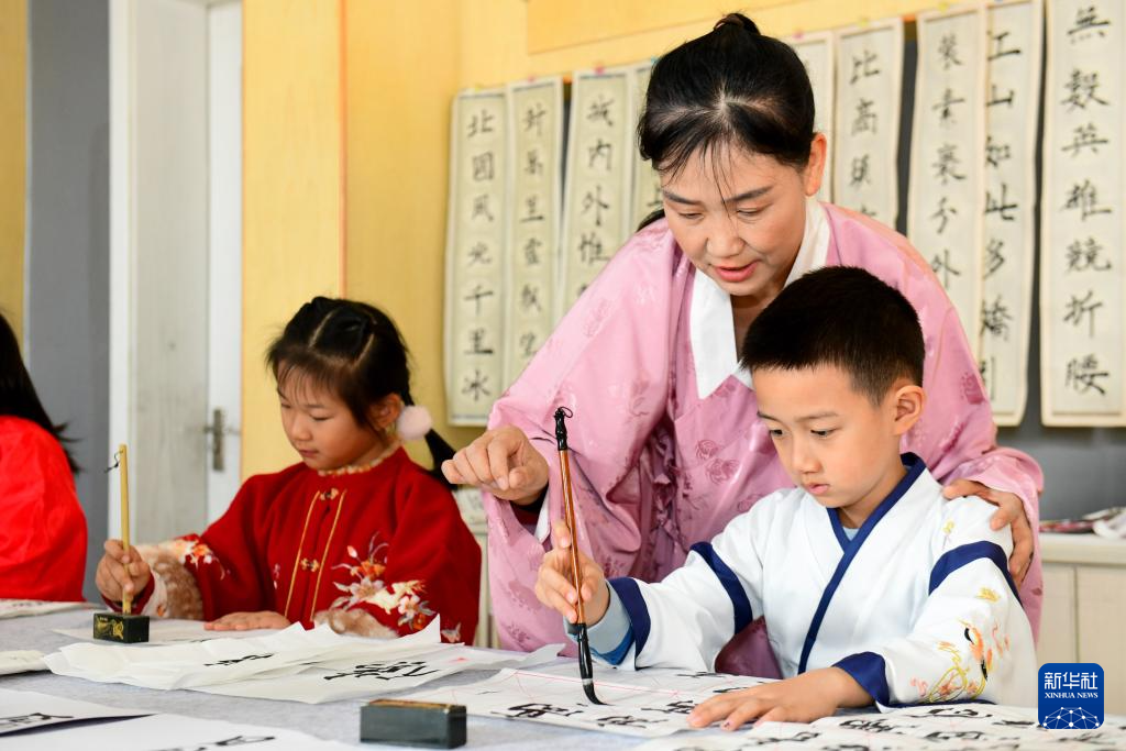 11月26日,在济南市市中区泉海小学,书法老师王云鑫在指导学生练习书法。