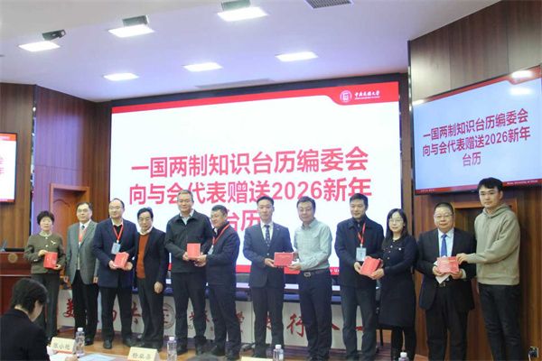 研讨会上,一国两制知识台历编委会向与会代表赠送了2026版新年台历。中央民族大学法学院副院长田飞龙表示,如今,“一国两制”实践进入了新阶段,这也为“一国两制”行稳致远、“一国两制”学术研究开辟了新空间、提出了新课题,专家学者应更好地把握时代变化,推动理论创新,探索适应新时代要求与大变局态势的“一国两制”自主知识体系和制度实践路径。他指出,新出版的“一国两制”知识台历融实用性、知识性和文化性于一体,由来自海峡两岸及港澳地区的编委共同编撰,且每年都有更新,2025年发生的有关“一国两制”的重大事件已经编入新的台历。希望能够对构建海内外支持“一国两制”的统一战线、加强“一国两制”文化传播与国际传播作出民间性、学术性贡献。”