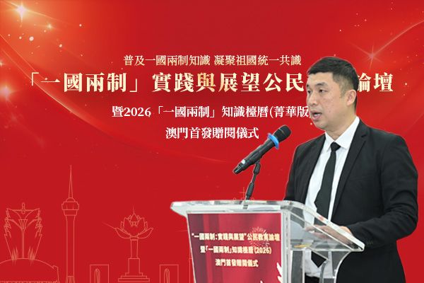 香港新闻社(记者 江海宗)12月19日澳门电 今日,“一国两制:实践与展望”公民教育论坛暨2026“一国两制”知识台历(菁华版)澳门首发赠阅仪式在澳门青年发展服务中心举行。澳门学人发展协会会长、“一国两制”知识台历编委陈青飞在致辞中强调,该协会始终以“凝聚智慧、培育专才”为使命,致力于培养具有爱国爱澳情怀、本地经验、国际视野和家国情怀的青年骨干,并将《一国两制知识台历》视为推动公民教育、深化青年对“一国两制”理解的重要载体。