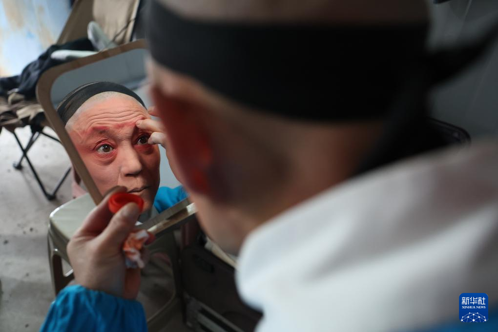 秦腔演员在年货大集上为演出做准备(1月19日摄)。