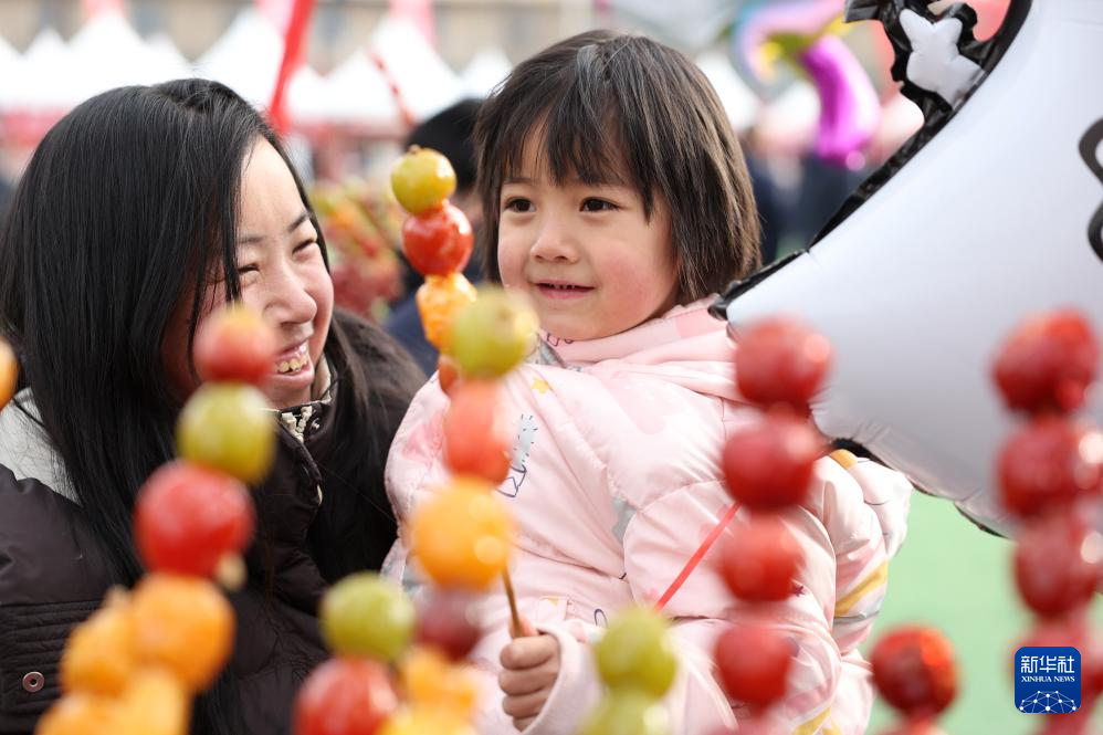 家长和孩子在年货大集上挑选糖葫芦(1月19日摄)。