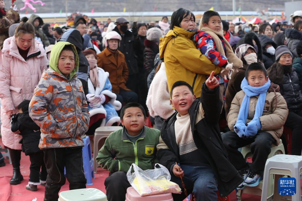 几位小朋友在年货大集上观看秦腔非遗演出(1月19日摄)。