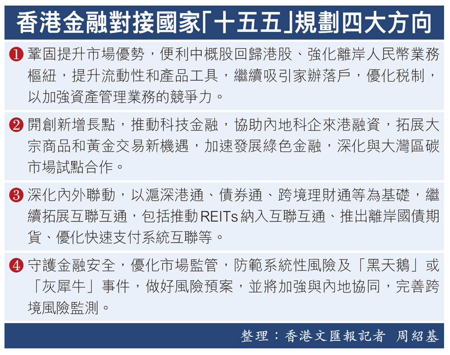 今年是国家“十五五”规划的开局之年,面对全球地缘政治风险上升,环球经济及金融格局重塑,新一届立法会昨日通过“制订香港特区发展愿景,主动对接国家“‘十五五’规划”议员议案,为本地经济注入新动能,同时在新的阶段为国家高质量发展及高水平对外开放贡献香港力量。特区政府财库局昨日指出,局方已制定中长期策略,将从4大方面推动香港金融业融入和服务国家发展大局,包括巩固提升市场优势、助力实体经济高质量新增长点、深化内外联动,以及守护金融安全。