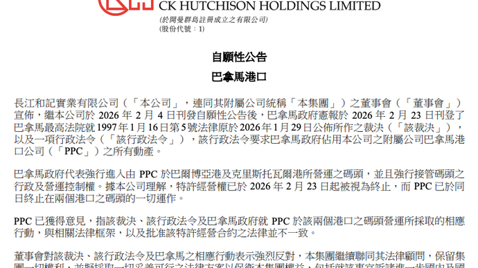公告称,巴拿马政府代表强行进入由PPC于巴尔博亚港及克里斯托瓦尔港所营运的码头,并且强行接管码头的行政及营运控制权。据公司理解,特许经营权已于2月23日起被视为终止,而PPC已于同日终止在两个港口码头的一切运作。