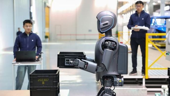 资料图:江苏无锡的一家民营企业工程师在调试人形机器人。图片来源:新华社