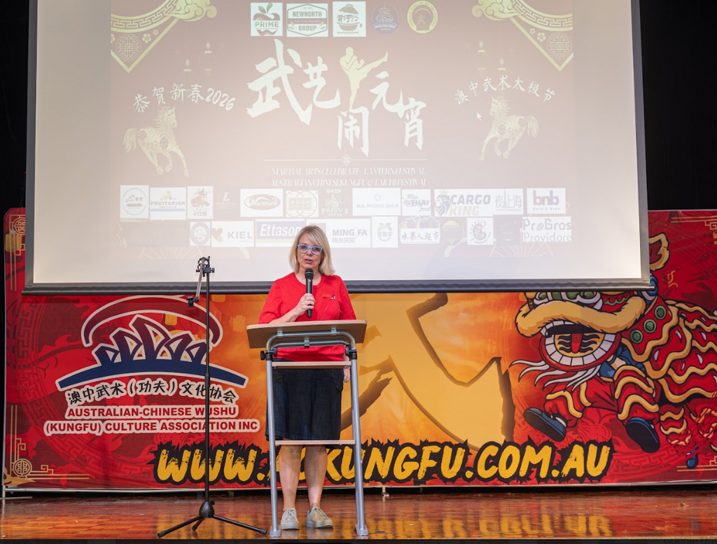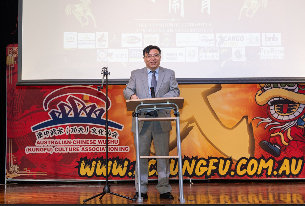 Strathfield市长蔡定杰在致辞中向大家致以诚挚的元宵节祝福,并祝贺“武艺闹元宵·澳中武术太极节”的成功举办。他表示,元宵节象征团圆与和谐,而这样的文化活动正是多元社会相互理解与交流的重要桥梁。通过武术这一独具魅力的中华文化名片,不同族裔和文化背景的人们得以相聚一堂,共同感受节日的喜悦与文化的魅力。他高度肯定华人社区长期以来为城市文化生活注入的活力,并表示多元文化的交融与共生,正是澳大利亚社会最宝贵的财富。