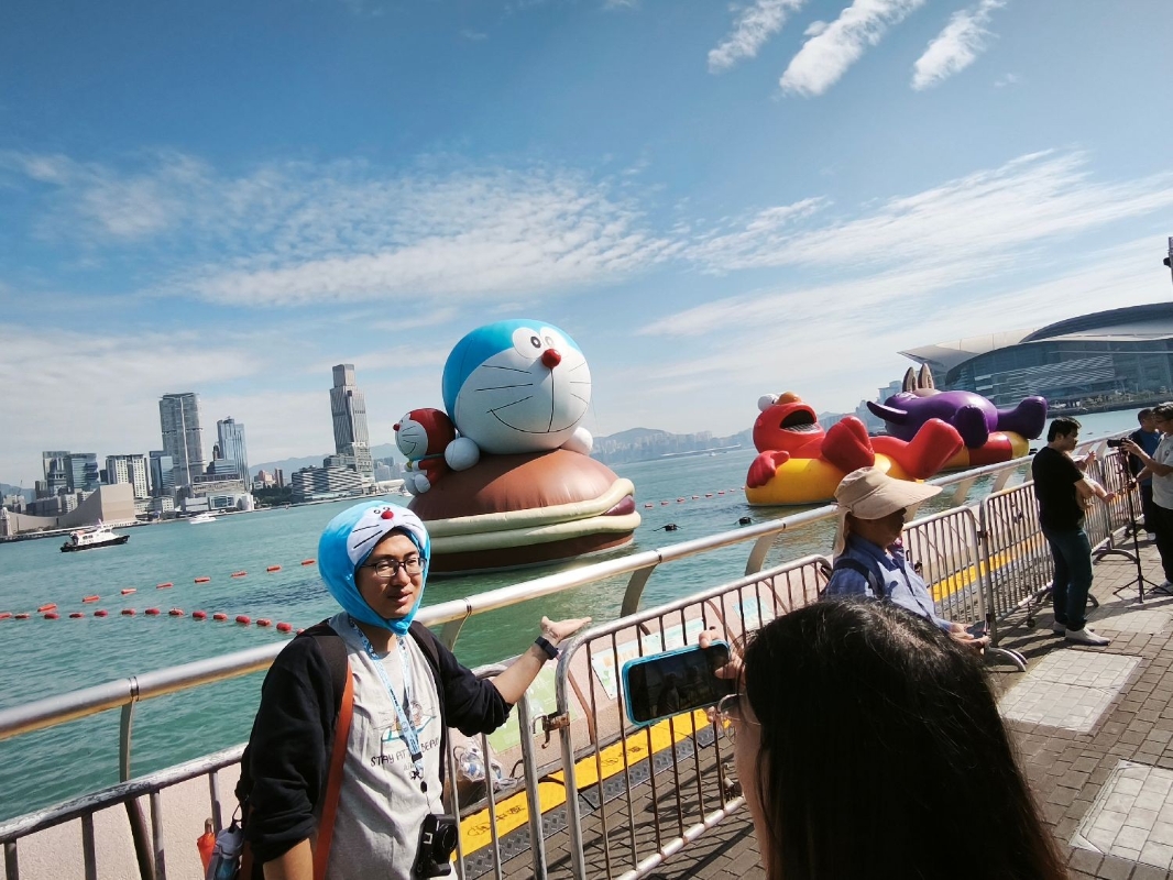 2025年10月26日,游客戴着哆啦A梦头套与哆啦A梦大型充气雕塑合影。香港中通社资料图