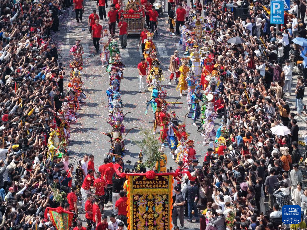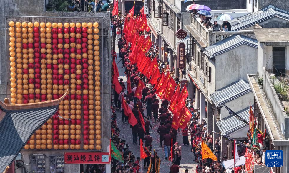3月11日,揭阳城隍庙会巡游队伍经过进贤门(无人机照片)。