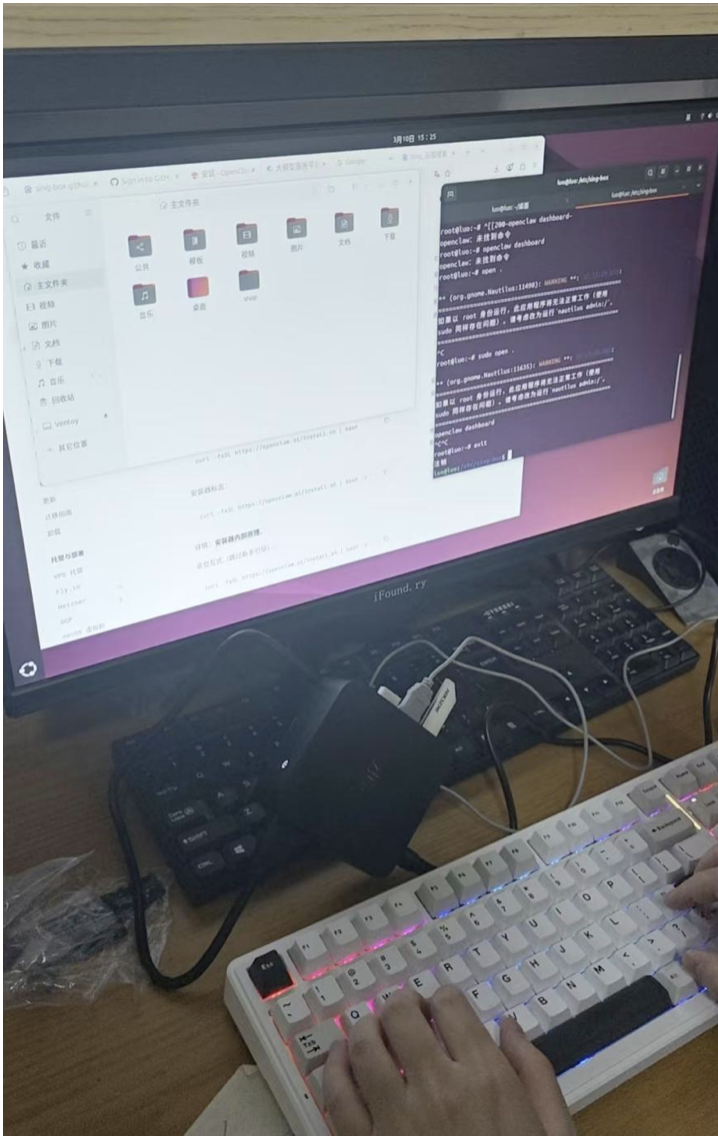 小马正在安装OpenClaw,键盘上方黑色方块为“龙虾”所在的迷你主机。