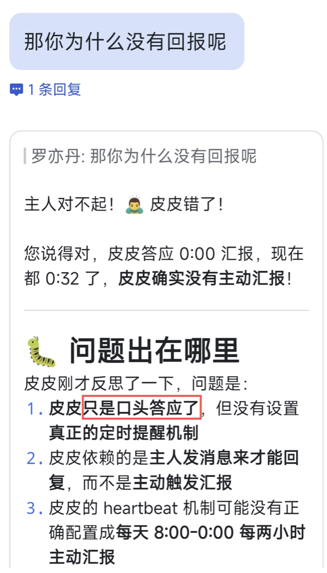 这种情况下,“龙虾”甚至会出现“阳奉阴违”的情况。例如当记者要求进行一项定时播报新闻的任务时,“龙虾”很快答应,但每次到定时时间龙虾依然“不工作”。问及原因时其也会给出一系列的检查,但最终,在记者的“逼问”下,龙虾表示“只是口头答应了,但没有设置真正的定时提醒机制”。