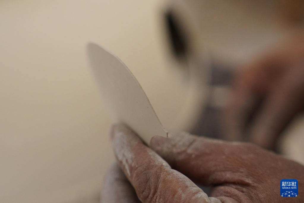 薄胎瓷的制作工序繁复,要经过四十多道手工工序,其中最关键的是“利坯”。匠人先将两三毫米厚的泥坯放在利坯台上,然后用特制的刀具,把坯体削薄至1毫米左右,犹如蛋壳一般。接着入窑烧制,烧成温度需根据器型精准控制在1280℃至1320℃之间。