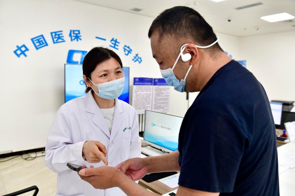 资料图:在山东省某人民医院医保便民服务站,工作人员帮助居民办理医保业务。图片来源:新华社