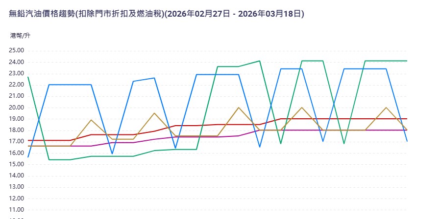 据香港消委会网页“油价资讯通”油价走势页面,在伊朗受袭前一天、2月27日,扣除门市折扣及燃油税,五间油公司每公升无铅汽油价钱介乎15.63至22.73元之间,至3月17日,五间油公司加价至17.03至24.13元。