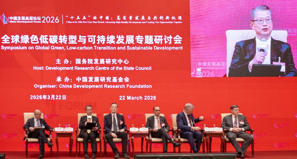 香港新闻社3月23日报道 财政司司长陈茂波22日早上出席中国发展高层论坛2026的开幕式及专题研讨会,并在下午的“全球绿色低碳转型与可持续发展”专题研讨会上发言。