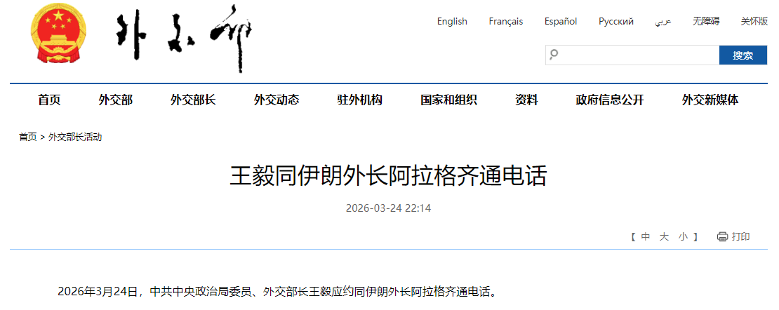 据中国外交部官网消息,王毅指出,谈起来总比打下去好。这符合伊朗国家和人民的利益,也呼应了国际社会普遍愿望。希望各方抓住一切和平机会和窗口,尽快启动和谈进程。中方将继续秉持客观公正立场,反对侵犯别国主权,积极劝和止战,致力于地区和平稳定。