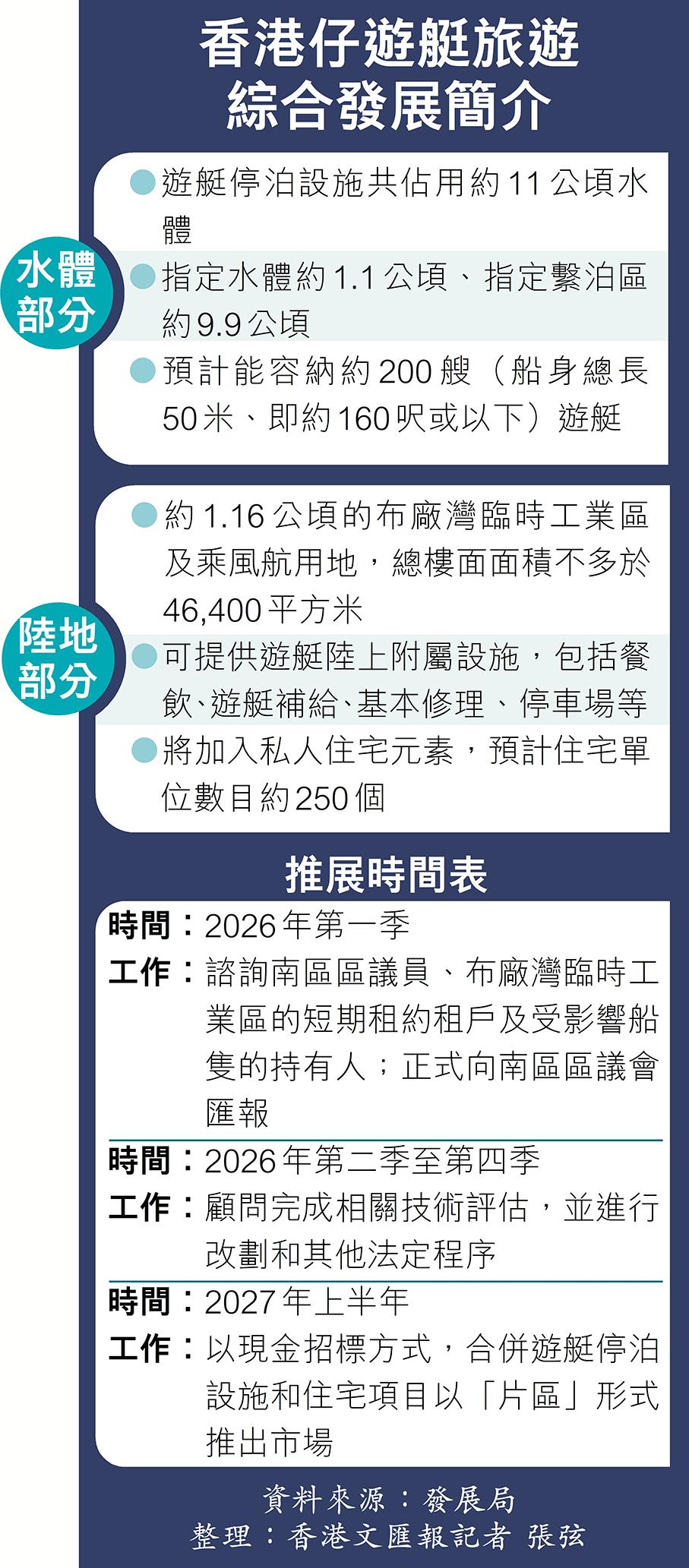 国家“十五五”规划纲要提出发展邮轮游艇、房车露营等休闲消费。香港特区政府发展局昨日宣布将香港仔避风塘扩建成游艇旅游综合发展区的详情,建议预留11公顷水体建设游艇停泊设施,并收回布厂湾临时工业区及乘风航用地,改造为提供餐饮、游艇补给等游艇陆上附属设施,以及兴建约250个住宅单位。发展局发言人表示,香港仔避风塘扩建部分能连结南区蓝绿资源和附近岛屿,并与邻近海洋公园等产生协同效应,形容市场意向浓厚,对新项目有信心,预计明年上半年会进行招标,最快2031年落成游艇停泊设施。
