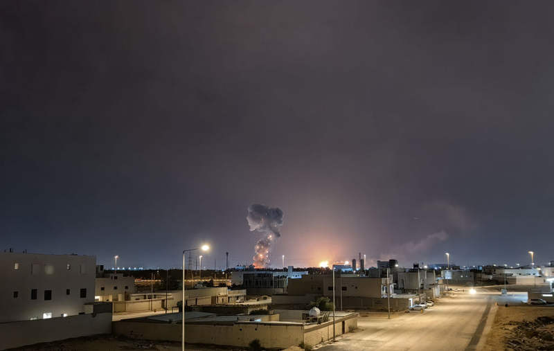 3月18日晚,沙特首都利雅得南部地区遇袭现场升起浓烟。新华社发