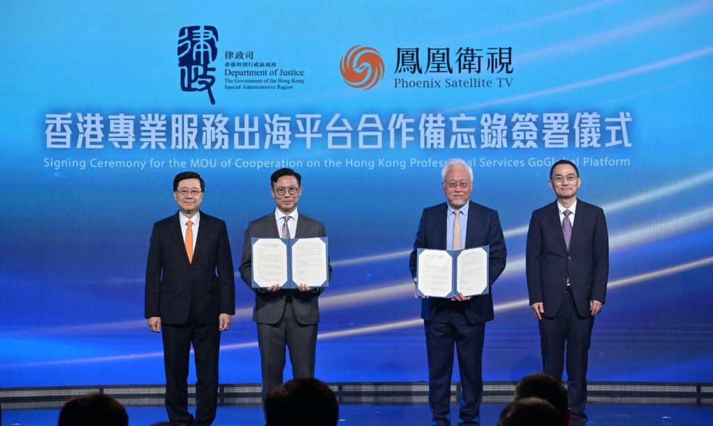 行政长官李家超(左一)和凤凰卫视董事局主席兼行政总裁徐威(右一),见证律政司副司长张国钧(左二)和凤凰卫视执行副总裁兼集团财务总监杨家强(右二)交换合作备忘录签约文本。