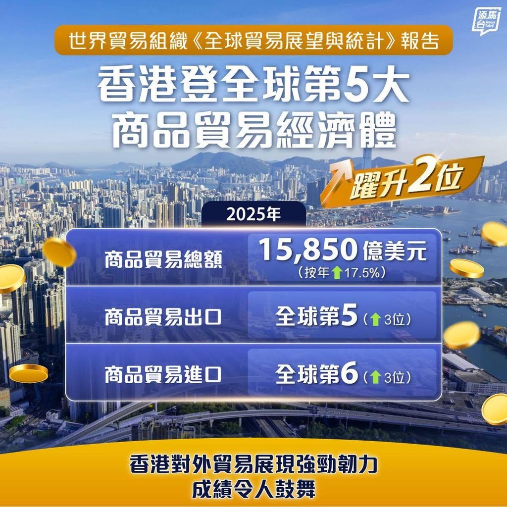 世界贸易组织最新发表《全球贸易展望与统计》报告,在2025年,香港紧随中国内地、美国、德国与荷兰,位列全球第五大商品贸易经济体。财政司副司长黄伟纶今日(4月3日)在社交平台发文指,本港2025年商品贸易总额达15850亿美元,按年上升17.5%,占全球总额3%,形容“成绩令人振奋”。