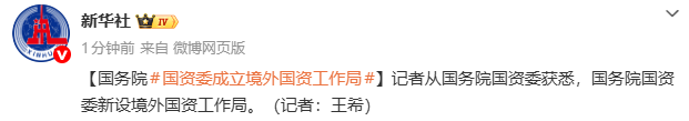 据新华社微博消息,记者从国务院国资委获悉,国务院国资委新设境外国资工作局。(记者:王希)