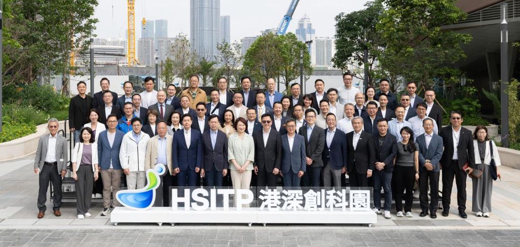 立法会主席李慧琼(前排左八)、工商及创新科技事务委员会主席吴杰庄(前排左六)、工商及创新科技事务委员会副主席霍启刚(前排左四)、其他立法会议员与创新科技及工业局局长孙东教授(前排左九)和其他政府代表,以及港深创新及科技园代表在河套香港园区合照。