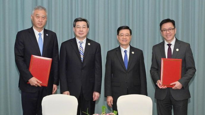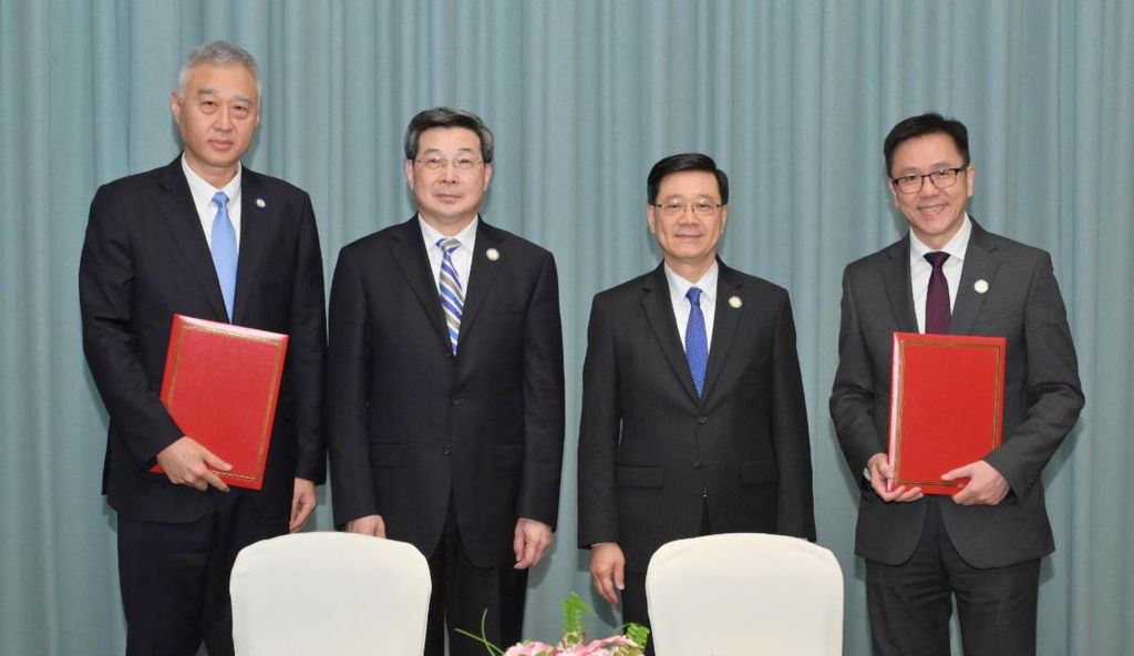 行政长官李家超(右二)、国家网信办主任庄荣文(左二)、创新科技及工业局局长孙东教授(右一)和国家网信办副主任王京涛(左一)在签署仪式合照。
