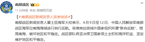 新京报讯 据南部战区官博消息,南部战区新闻发言人翟士臣海军大校表示,4月9日至12日,中国人民解放军南部战区海军位南海海域进行例行巡航。菲律宾拉拢域外国家组织所谓“联合巡航”,搅局南海,破坏地区和平稳定。战区部队将坚决捍卫国家领土主权和海洋权益,坚定维护地区和平稳定。