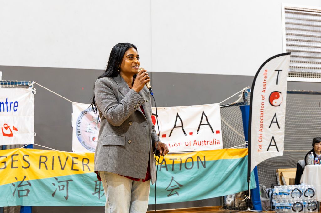 出身于斯里兰卡的Barton选区联邦议员爱诗(Ash Ambihaipahar)则分享了她的切身感悟。从小在好市围长大的她提到,儿时每天步行去好市围公立学校时,总能看到许多当地居民练习太极,这一画面至今令她印象深刻。爱诗非常认同王愚总领事的观点,她指出,在当前充满动荡的世界局势下,太极在社区中的作用比以往任何时候都更加重要;它不仅能帮助在本地和国际层面维护和平与团结,还能为个人带来内心的平静。她还特别提到,比赛当天恰逢东正教复活节,不同背景的人们因太极相聚于此,这正是澳大利亚作为移民国家庆祝多元习俗、将和谐与和平融入日常生活的体现。