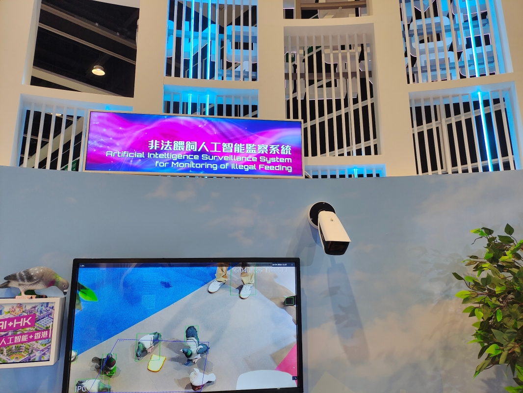 进入展馆,最先吸引记者目光的,是一群三三两两散布在地上的鸽子,在它们的上方有一个貌似摄像头的东西。原来这就是香港渔农自然护理署自2025年9月投入使用的“非法喂饲人工智能监察系统”。