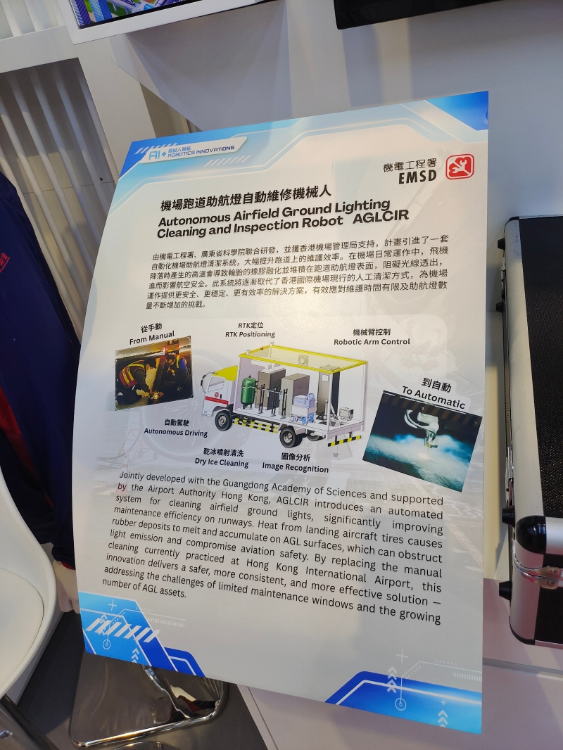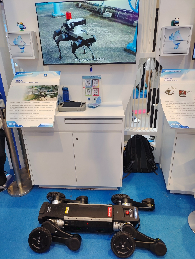 以上两种AI+政务应用,只是展会上20多个政府部门和公营机构等提供的、100多项科创成果中的很小部分。在这里,记者还看到了:香港机场为机场跑道的助航灯进行自动清洁的机器人、香港海关搜查犬“智能犬舍管理系统”、一个APP通行1400项政府服务的“智方便”程式、机电工程署为检测升降电梯缆绳维护情况开发的“缆视通”系统、消防处的物联网火警侦测系统等,而为检查水务管道、空气污染、山体滑坡等而应用的机器狗、无人机更是几乎每个重点部门都有使用。重要的是,这些装备都是已经实际应用在香港公共服务中的产品。