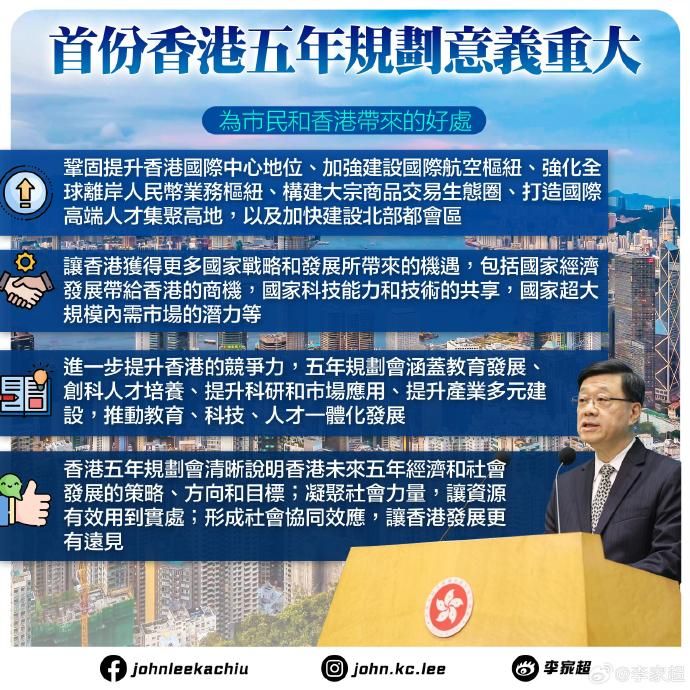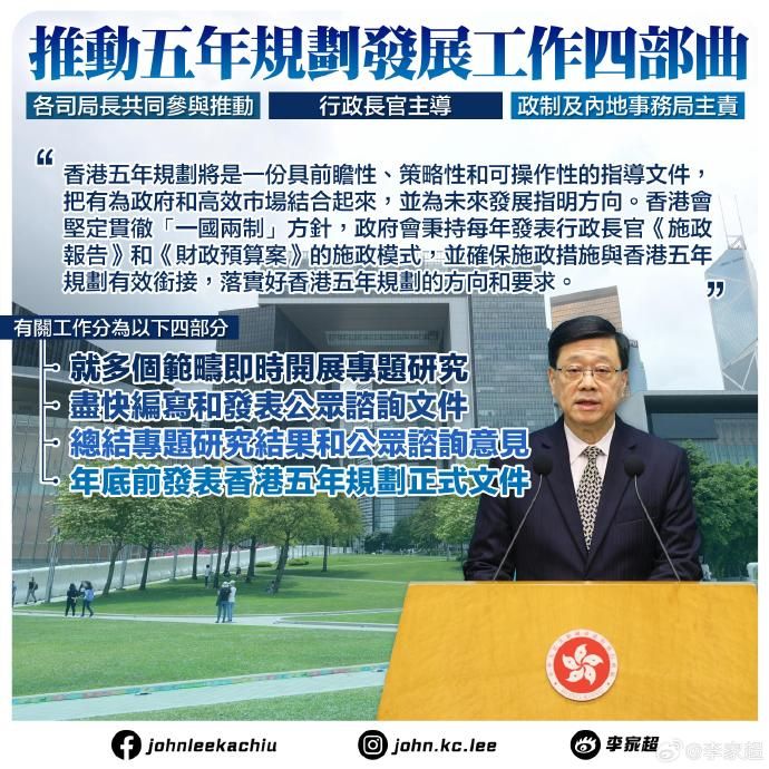 他强调,香港五年规划将是一份前瞻性、策略性、可操作性兼备的指导性文件,实现有为政府与高效市场有机结合。特区政府将坚定贯彻“一国两制”方针,保持《施政报告》《财政预算案》常规施政模式,确保各项举措与五年规划有效衔接,扎实落实规划部署,推动香港长期繁荣稳定。