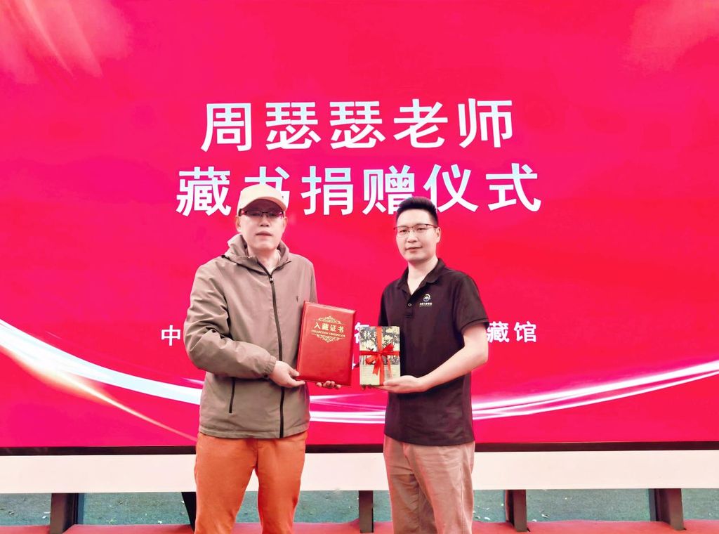 “中国当代作家签名版图书珍藏馆”馆长曹孟良(右)向周瑟瑟颁发捐赠证书。